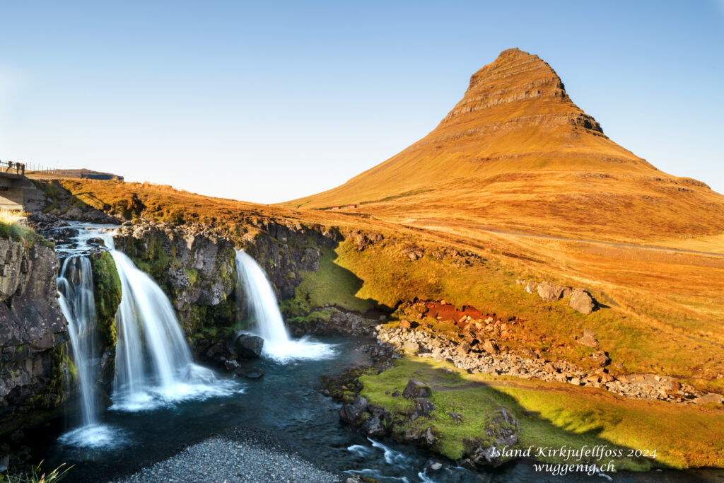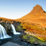 Der Kirkjufellfoss und der gleichnamige Berg Kirkjufell befinden sich auf der Halbinsel Snæfellsnes im Westen Islands, in der Nähe des Städtchens Grundarfjörður. Der Kirkjufellfoss mit dem Kirkjufellberg im Hintergrund bietet ein besonders eindrucksvolles Bild und wird oft als eine der malerischsten Landschaften Islands bezeichnet. Der Wasserfall ist mächtig und das Wasser stürzt in Kaskaden herab (auf dem Bild nicht zu sehen).