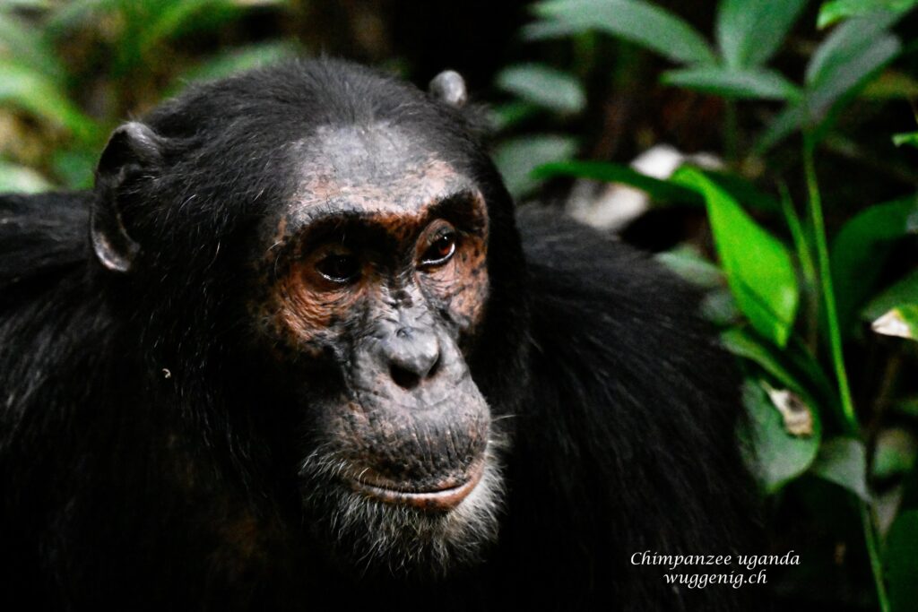 Das Bild zeigt einen einzelnen Schimpansen inmitten des üppigen Regenwalds Ugandas. Diese Begegnung war ein echtes Highlight deiner Reise – intensiv, überraschend und zutiefst beeindruckend. Der Moment, eingefangen in diesem Foto, erzählt von Respekt gegenüber der Natur und einem Erlebnis, das sich tief ins Gedächtnis eingebrannt hat.