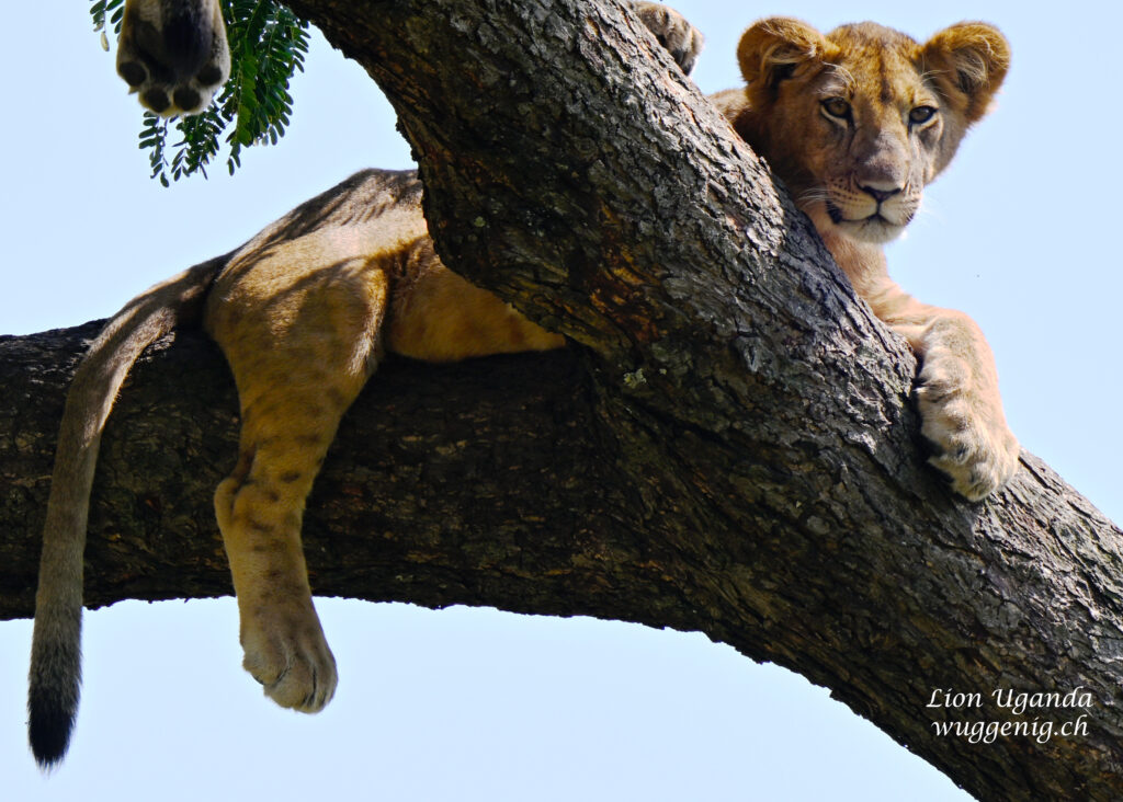 Der junge Löwe ruht gelassen, doch seine wachsamen Augen verraten Aufmerksamkeit. Im Ishasha-Nationalpark gehört es zum Alltag, Löwen hoch oben in den Bäumen zu entdecken